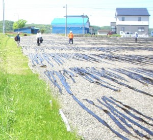 昆布干し作業が見られる沿岸部。建物の向こうに霧多布湿原が広がる