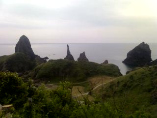 松江市本庄から島根県美保関町七類(しちるい)港へ。七類港からフェリーで隠岐諸島の西ノ島町別府港へ。島に着くといままで雲っていた空から太陽がさしてくる。まず牛馬が放牧されているいる島の東南部を目指す。激坂を上って摩天崖展望所へ行こうとすると、途中で牛が道路をふさいでいる。自転車を降りて恐る恐るその横をそおっと通って展望所へ。この辺りは牛馬の放牧で草地景観が保たれている。またここからの景観は素晴らしい。残念ながら逆光で、携帯の写真では素晴らしい景観が表現できない。続いて国賀海岸へ。ここも海触断崖が続く素晴らしい景観だ。すっかり隠岐(お気)にいりのところとなって、ここに泊まることにする。走行距離28.91km。