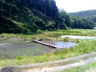 6月14日 キャンプ場を出ようとすると、入口で草刈をしている人がいたので、コウノトリはどこでみられるか尋ねてみる。加陽地区だという。加陽地区で散歩をしている人がいたので話かけてみる。加陽東浦水利組合理事長の長砂さんで、コウノトリの餌場の保全にも携わっている。この地区の湿原は国の減反政策で米作りをやめた所。面積は17町歩。国のビオトープの補助金がついていたので、水路を作って湿原にし、魚を放流したり草刈をしたり、コウノトリの餌場の保全に努めてきた。しかし平成19年度で国の補助金が打ち切られた。20年度は市の単独の補助金がついたが、21年度以降はどうなるのか心配だという。残念ながら今日はここではコウノトリはみることができなかった。長砂さんに玄武洞ミュージアムの杞柳細工の実演と加島地区のコウノトリの餌場をぜひみるようにと勧められたので行ってみる。残念ながら今日は杞柳細工の職人が来ないということで実演はみられない。製品があるのでたずねてみると、杞柳製品は円山川のもたらす湿地と肥沃な土が杞柳「コリヤナギ」の生育に適している。製品は柔らかさと適度な硬さを備えており、親しみのある味わいにあふれているという。戸島地区では待望のコウノトリをみることができた。飛んでいるのが2羽、湿原にいるのが2羽。残念ながら遠くの方にいるため携帯の写真ではよくわからない。