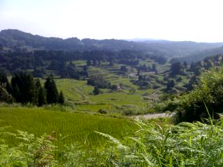 25日、栄村—松之山(新潟県十日町市—松代(十日町市) 秋山郷切明から屋敷を通って秋山郷総合センターとねんぼを訪ねる。秋山郷の資料室では古い生活様式等が紹介されている。職員の石沢さんの話では、とねんぼとは秋山郷の方言でひとつにまとまるという意味だそうだ。栄村がにほんの里100選にえらばれたのは、お年寄が暮らしやすいまちづくりが認められたのではないかと思う。そのため山里の暮らしがいまも保たれているという。残念ながら今回のツーリングでは長く滞在したわけではないので、山里の暮らしぶりは見ることはできなかった。続いて次の目的地松之山へ。松之山では十日町市松之山支所を訪ね、観光協会の桑原さんから説明を受ける。地域全体に手入れの行き届いた棚田があるといい、地図を見ながら詳しく説明してくれる。みて回って特に良かったのは、写真の天水島(あまみずしま)の棚田、今でも素晴らしい景観だが、田植えの終わったすぐ後だと、水が張られた状態でさらに素晴らしいと思う。この後松代まで走り、松代城址公園キャンプ場に泊まる。走行距離76、49km。