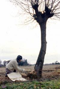 ある時、畦で木を切っている老人に会いました。もうすぐ圃場整備が始まるので、その前に切って薪にするとのこと。この木は、その老人が植えたものだそうです。