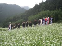 この花祭りは、種まきから蕎麦打ちまで行う「蕎麦づくり入門」の一環として、毎年行われています。今年も、県内外から大勢のオーナーが参加し、標高700mの山間地で、真っ白い蕎麦の花畑を満喫し、地元の獅子舞を楽しみました。