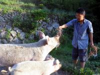 自ら生態系を守り、1次産業再生に努めることを自治会規則で確認。無農薬のビワ栽培、野菜くずなど島内の資源で豚も飼う。